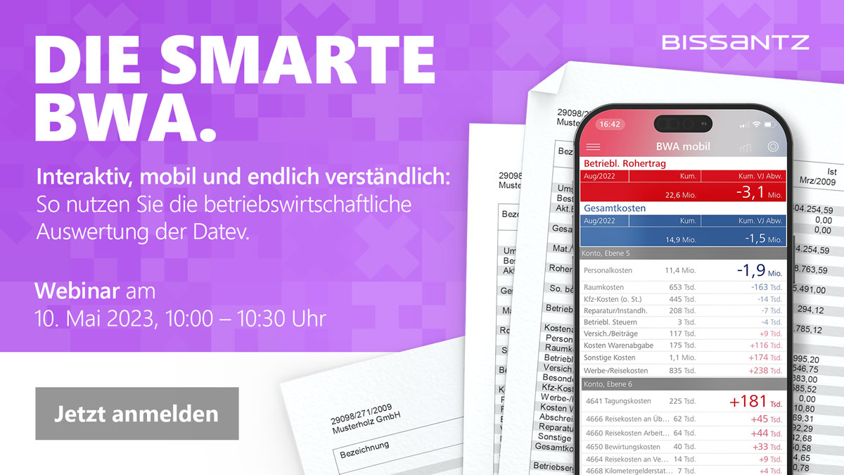 Mit Bissantz machen Sie die BWA von Datev für Ihre Mandanten verständlich und halten sie auf dem Laufenden, wie es um ihre Geschäfte steht – interaktiv, mobil und zukunftsorientiert.